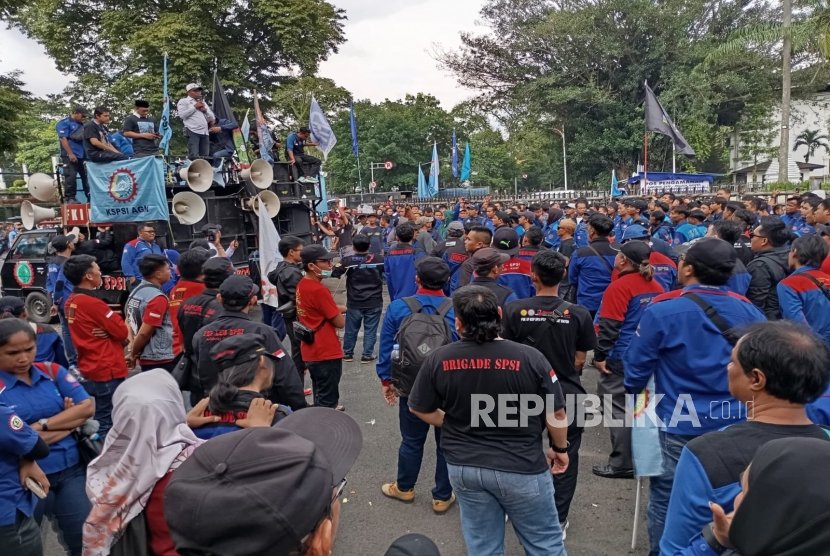 REPUBLIKA.CO.ID, BANDUNG — Ratusan buruh dari berbagai serikat pekerja melakukan aksi demonstrasi di Jalan Diponegoro, tepatnya di depan Gedung Sate, Kantor Gubernur Jawa Barat, Senin (29/12/2025). Mereka menuntut agar Gubernur Jawa Barat Dedi Mulyadi merevisi upah minimum sektoral kabupaten dan kota (UMSK).