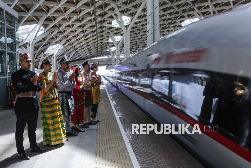 Petugas berpakaian adat daerah memberi salam hormat saat keberangkatan kereta cepat di Stasiun Kereta Cepat Whoosh Halim, Jakarta Timur, Senin (10/11/2025). Dalam rangka memperingati hari Pahlawan petugas PT Kereta Cepat Indonesia China (KCIC) mengenakan pakaian adat dari sejumlah daerah sebagai bentuk penghormatan kepada para pahlawan bangsa.