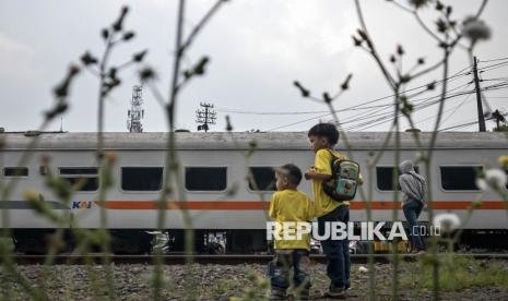 Warga menyaksikan rangkaian kereta api (KA) melintas di Stasiun Cimahi, Kota Cimahi, Jawa Barat, Sabtu (11/10/2025). Pemerintah menargetkan elektrifikasi jalur kereta komuter rute Padalarang-Cicalengka sepanjang 42 kilometer di wilayah Bandung Raya akan rampung dan dapat dioperasikan paling lambat tahun 2027 sebagai bagian dari upaya modernisasi transportasi publik di Jawa Barat yang dapat memangkas waktu tempuh perjalanan harian masyarakat secara signifikan, dari dua jam menjadi sekitar satu jam. (FOTO : ANTARA FOTO/Abdan Syakura)