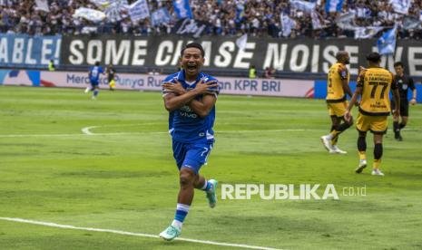 Pesepak bola Persib Bandung Beckham Putra Nugraha melakukan selebrasi usai mencetak gol ke gawang Persija Jakarta saat pertandingan lanjutan BRI Super League di Stadion Gelora Bandung Lautan Api (GBLA), Bandung, Jawa Barat, Ahad (11/1/2026). Persib Bandung berhasil mengalahkan Persija Jakarta dengan skor akhir 1-0. Gol Persib Bandung dicetak Beckham Putra Nugraha di menit ke-5 pertandingan. (FOTO : ANTARA FOTO/Abdan Syakura)