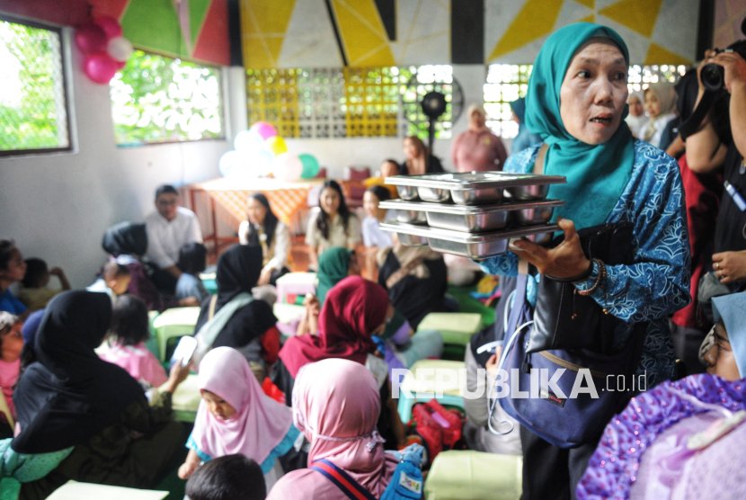 Ibu-ibu membagikan hidangan makan bergizi gratis (MBG) untuk balita, ibu hamil, dan ibu menyusui di Posyandu Dahlia, Ciracas, Jakarta, Jumat (10/1/2025).
