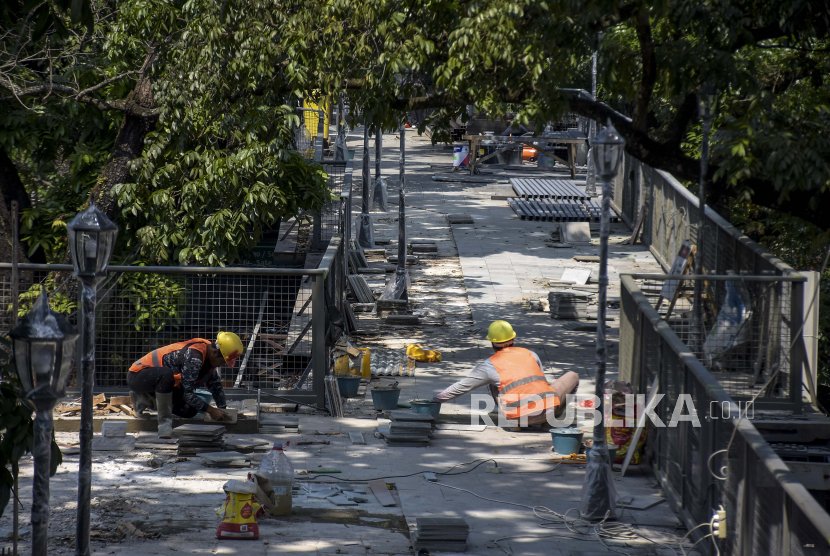 Pekerja menyelesaikan proyek pembangunan Teras Cihampelas tahap kedua di Jalan Cihampelas, Kota Bandung, Jawa Barat, Ahad (11/6/2023). Pemerintah Kota Bandung melanjutkan pembangunan tahap kedua Teras Cihampelas dengan nilai proyek sebesar Rp2,75 miliar yang rencananya rampung pada September mendatang.