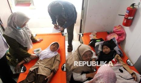 Para Pelajar yang mengalami keracunan Makanan Bergizi Gratis (MBG) dibawa kei Puskesmas Cibodas, Kecamatan Lembang, Kabupaten Bandung Barat, Rabu (29/10/2025). Seratus lebih pelajar dari sejumlah sekolah mengalami gejala keracunan usai menyantap MBG di Cibodas, Lembang, Selasa (28/10/2025). Mereka merasakan mual dan muntah hingga harus mendapat perawatan medis. Para pelajar tersebut berasal dari tiga sekolah, yaitu SDN 2 Cibodas, SDN Buahbatu, SMPN 4 Lembang. (FOTO : Edi Yusuf)
