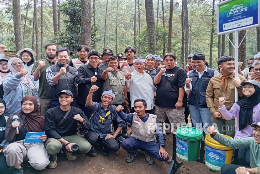 Sekretaris Daerah (Sekda) Provinsi Jawa Barat Herman Suryatman melepas pelaksanaan Bebersih Leweung yang digagas Republika di area Wisata Gunung Kuda, Cibiru, Kabupaten Bandung, Sabtu (11/10/2025).