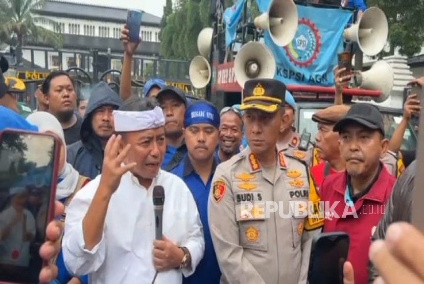 REPUBLIKA.CO.ID, BANDUNG–Sekretaris Daerah (Sekda) Provinsi Jawa Barat (Jabar) Herman Suryatman menemui para buruh yang melakukan aksi demonstrasi di Jalan Diponegoro, Kota Bandung, tepatnya di depan Gedung Sate, Kota Bandung, Senin (29/12/2025). Ia menegaskan Gubernur Jawa Barat Dedi Mulyadi bakal melakukan revisi terhadap upah minimum sektoral kabupaten kota (UMSK).